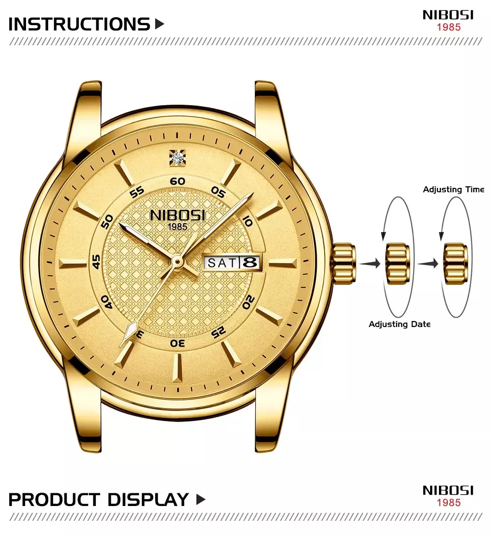 Especialmente fabricado em aço inoxidável de excelentíssima qualidade, lente de cristal de safira e acabamento de quartzo, o luxuoso relógio Nibosi proporciona um aspecto de modernidade e muita elegância para o seu dia-dia